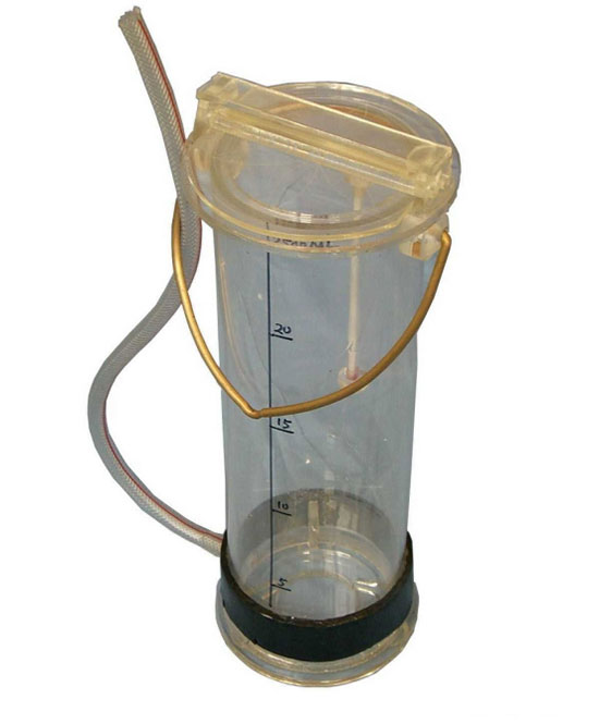 有機玻璃采水器:由桶體、帶軸的兩個半圓上蓋和活動底板、配重塊、溫度計、橡膠管、止水夾組成。